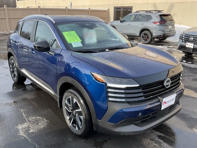 2026 Nissan Kicks SV AWD Deep Blue Pearl with Charcoal interior equipped with 2.0L DOHC 4 cylinder engine equipped with Intelligent All Wheel Drive, Automatic Emergency Braking with Pedestrian Detection, Rear Automatic Braking, Blind Spot Warning, Rear Cross Traffic Alert, Lane Departure Warning, Automatic Headlamps with High Beam Assist, 12.3 color touch screen, Back-up Camera, Nissan Connect featuring Wireless Apple CarPlay & Android Auto, Intelligent Cruise Control, Power Windows, Power Door Locks, Nissan Intelligent Key with Approach Unlock & Walk Away lock, & 17 Alloy Wheels. Equipped with the Cold Weather Package and Premium Package including Remote Start, Heated Front Seats, Power Panoramic Sunroof, and Roof Rails. All 2026 Nissan included 36 months/36,000 mile Bumper to Bumper and 60 months/60,000 mile Powertrain Warranty.
